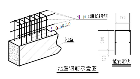 三、池壁拆除清理漏出砼池壁頂面,頂面上彈出兩道線間距190mm,留出兩側25mm鋼筋保護層,號出打眼植筋間距線為150mm,打眼深為120mm,為膠植鋼筋。
