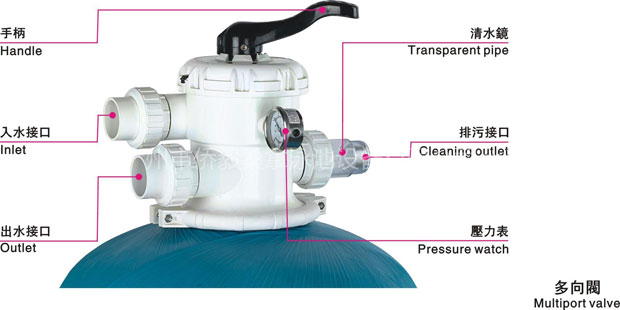 1) 過濾(FILTER):設定控制閥在此位置,就會有一般的過濾和吸塵功能,水流由上往下,經濾層后回到游泳池內,完成扣留污染粒子功能。