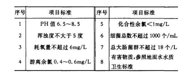 游泳池水因為直接與人體接觸,池水可能成為疾病的傳染源。因此,世界各國對游泳池的水質都有明確的要求,并制訂了相關的衛生標準。在我國,游泳池初次充水和使用過程中補水應符合《生活飲用水衛生標準》GB5749—85的規定,游泳池水質應符合國家技術監督局和衛生部聯合頒布的GB9667—1966中關于人工游泳池水質衛生標準,詳見表。