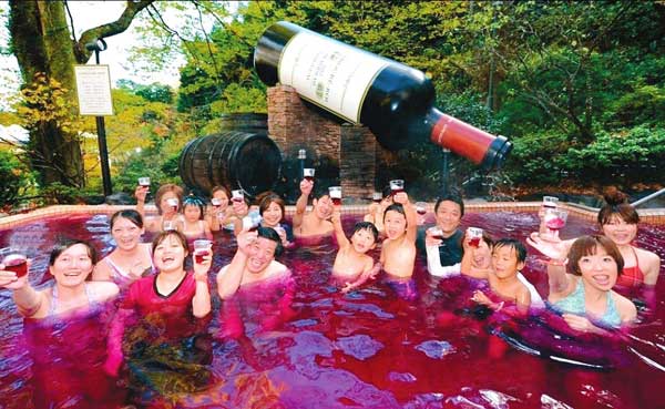 紅酒浴,紅酒有助于美容養(yǎng)顏、養(yǎng)氣活血,緩解皮膚松弛,紅酒對輕微貧血的女性有好處,促進胃腸消化能力。躺在浴池中,有木有微醺的感覺呢。