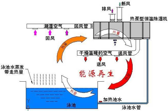 三集一體熱泵的工作原理,簡言之,即是將池水表面蒸發熱損回收利用,轉移入池水和空氣中,彌補池水和空氣熱損,同時實現空氣調節除濕功能。