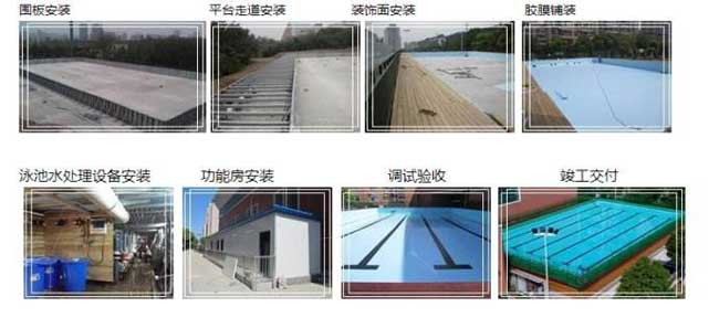 在確定實施方案后工廠組織生產(chǎn),拼裝式游泳池的各部件均在工廠生產(chǎn)完成,完成生產(chǎn)后一次性運至安裝現(xiàn)場進行整體組裝。安裝前需要一塊平整、堅實的空曠場地,使用方提供安全的380V高壓電(30-50KW),上下水市政管路。安裝過程為15-25天(根據(jù)泳池大小而定)。